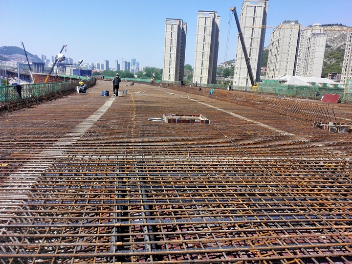 高架橋采用整體式一塊板斷面,雙向六車道,總寬25m,具體為:0.5m 防撞墻+11.75m 機動車道+0.5m 中央防撞墻+11.75m 機動車道+0.5m 防撞墻,包含26聯主線高架橋梁。