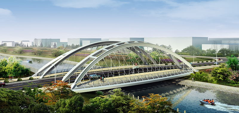 肋下承式梁拱組合體系橋,橋跨 70 米,寬度 33.5-42.9 米;聚賢橋路南橋?yàn)樯铣惺搅汗敖M合橋,橋跨組合為